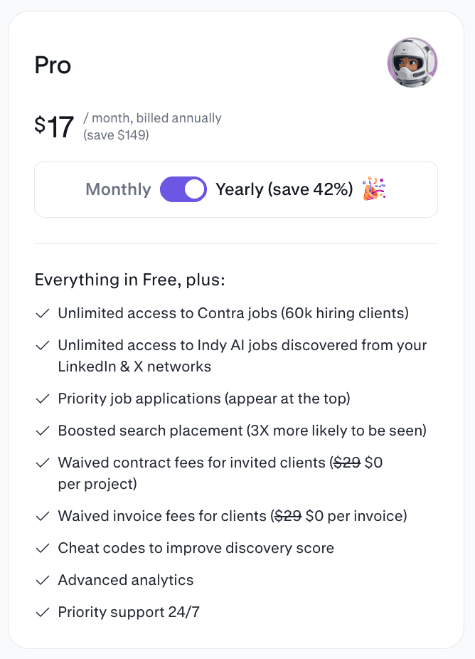 Contra Pro costs $199 per year (or monthly) and is aimed at freelancers actively growing their business.
