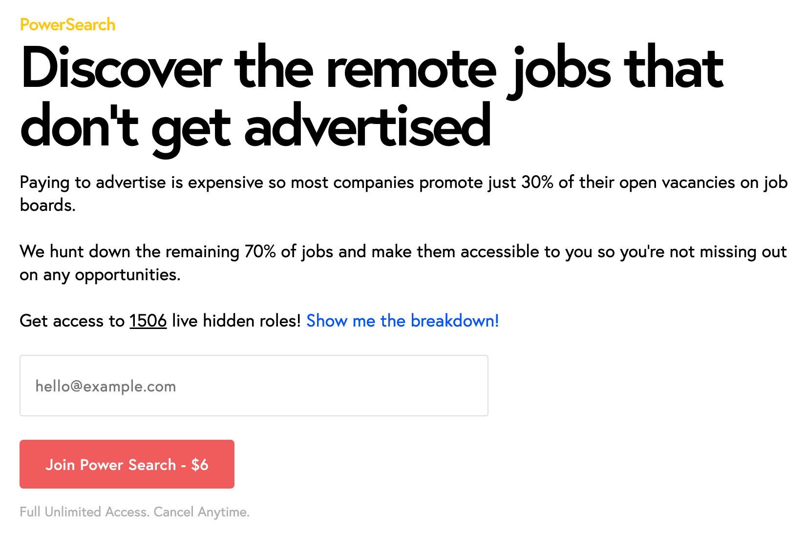 According to JustRemote, many companies only publicly post a portion of their open roles. Power Search aggregates data from remote-friendly companies to surface additional opportunities, particularly for proactive job seekers who want broader visibility. Access is subscription-based, cancellable at any time, and separate from the free job board.