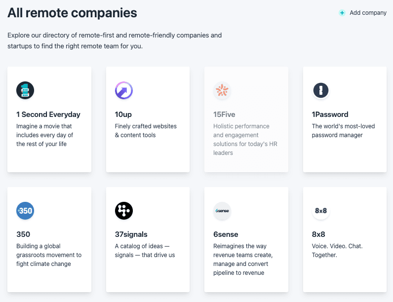 The platform also publishes editorial content about remote work culture, tools, and companies.