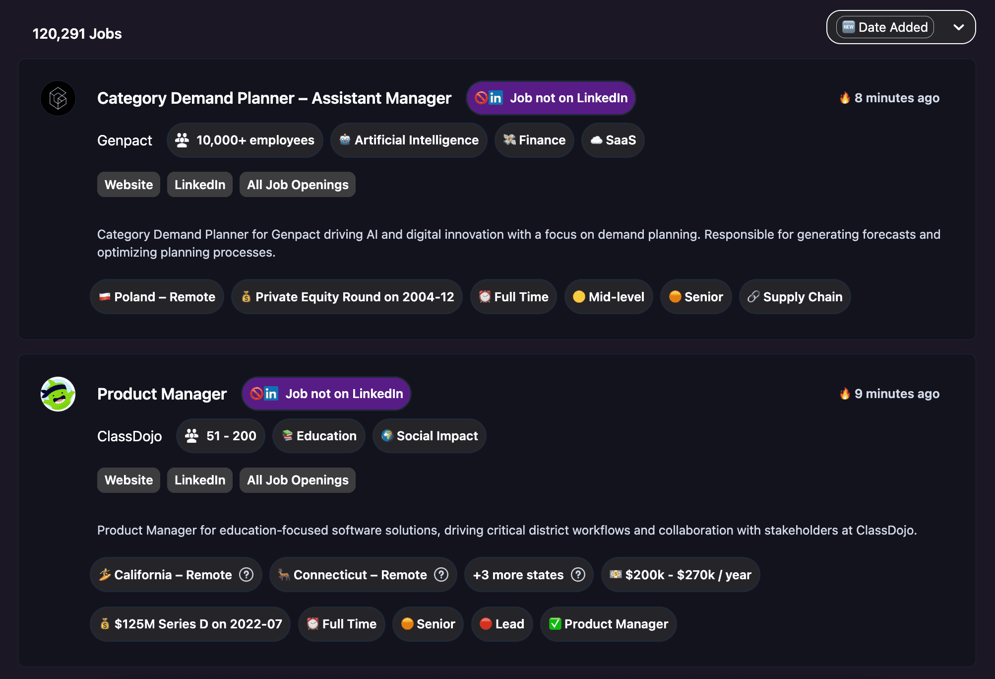 Jobs scraped from company websites (not just paid postings)