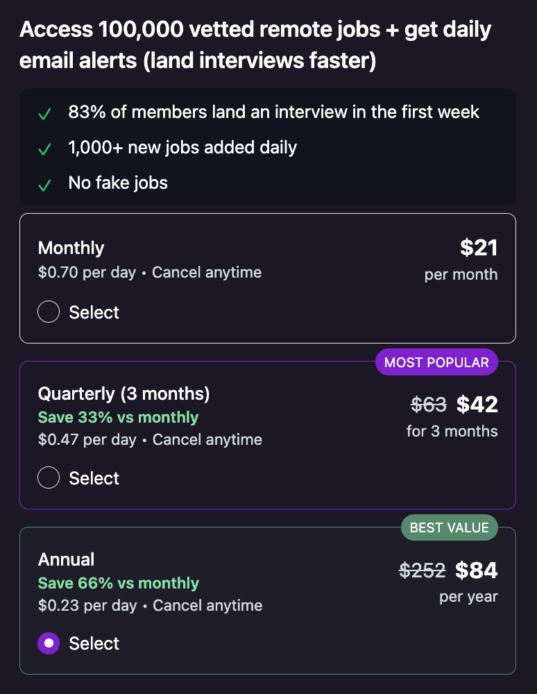 Remote Rocketship sells access to job listings and discovery tools, which is standard in the remote job board space. As with any job board, platform legitimacy does not guarantee every employer listing is ideal, so job seekers should still review roles carefully.